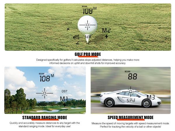 6 Versatile Measurement Modes Designed for all skill levels, this golf rangefinder offers six modes: slope compensation, golf flag locking, horizontal and height ranging, speed measurement, and continuous scan mode. Whether you're gauging elevation changes or locking onto a flag, it delivers fast and reliable results.