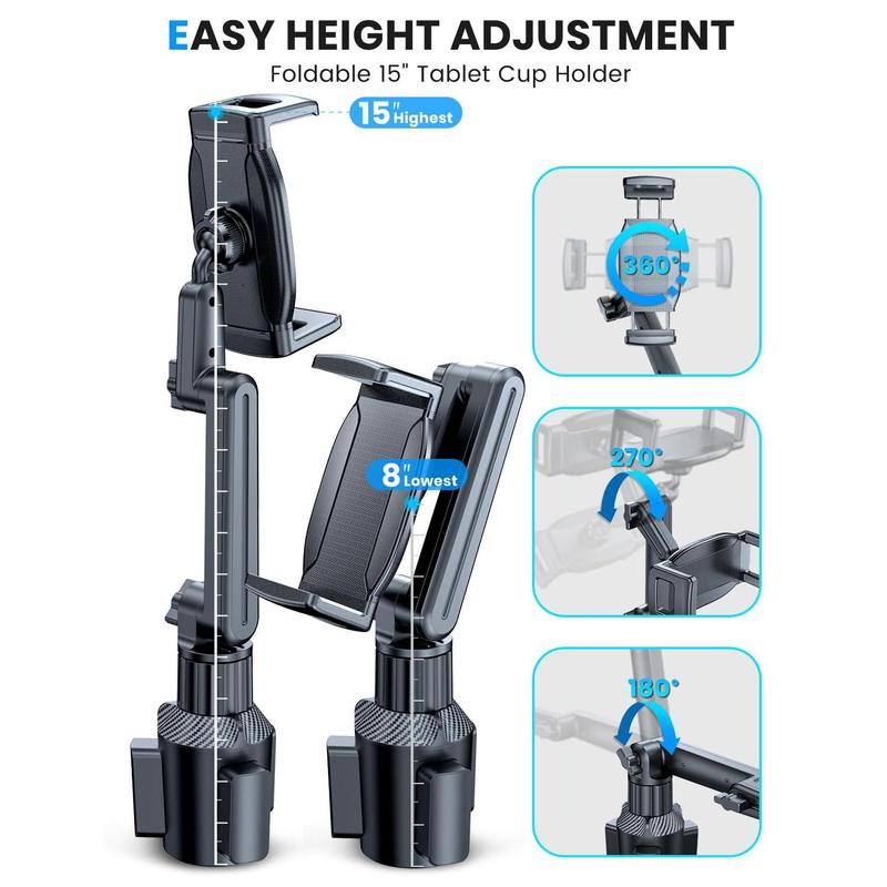 👍【Foldable 15" Height Car iPad Holder for Cup】: The total height of thistablet cup holder mount is 15". You have the freedom to adjust the height of the cup holder iPad mount according to your needs. The clamp can rotate 360 degrees, offering optimal flexibility. The reinforced arm ensures the stability and durability of the iPad car mount cup holder. Compared to gooseneck iPad cup holder, our rigidly connected arm iPad holder provides even better stability.